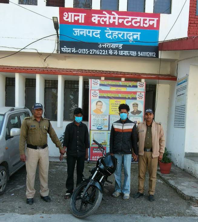 देहरादून। क्लेमेंटटाउन क्षेत्र में हुई वाहन चोरी की घटना का दून पुलिस ने मात्र 10 घंटे में खुलासा करते हुए दो अभियुक्तों को गिरफ्तार कर लिया। पुलिस ने उनके कब्जे से चोरी की गई मोटरसाइकिल UK07 FJ 4642 भी बरामद कर ली है।